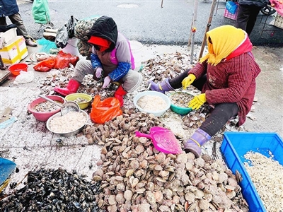 记者看到,杜昌华雇的三位四川籍女子都是扇贝快速剥壳的好手。她们裹着头巾、戴着手套,雨靴一蹬,手起壳落,干脆利索,就像变戏法一样,一眨眼的功夫,鲜嫩的扇贝肉就剥了好几个,不一会儿就堆成了小山。不等小山变成大山,心急的市民就抢先要货。“有的老顾客一次买三十多斤,自己带回家慢慢吃,炒菜、做汤、包饺子都好。”早上7时出摊,下午2时许,杜昌华就可以早早卖完收摊了。她经常从大集上买些蔬菜带回家。