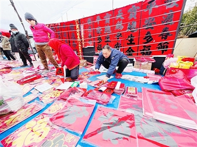 平安多福、宝地生金、幸福人家喜事多……喜庆的字画映入眼帘。年画、福字、挂件、窗花、对联、泥老虎,装点节日氛围。“福字最受欢迎,有立体的,有单面的,根据大小和设计,一个福字几元到十几元的不等,烫金的也很漂亮。”在摊主们的介绍下,市民精心挑选,欢欢喜喜地“接福”带回家。
