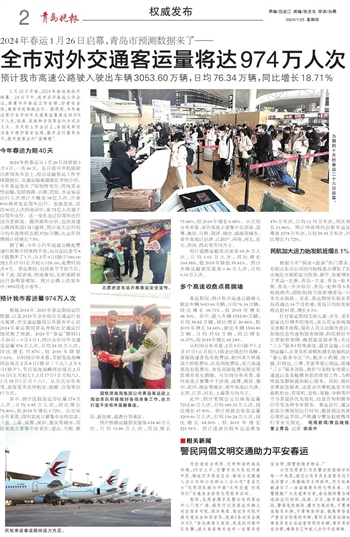 根据2019年、2023年春运期间运行数据,以及2023年全年综合交通运行有关规律,市交通运输局公共服务中心对2024年春运期间青岛市综合交通运行情况做了预测。2024年“春运”期间(1月26日-3月5日),预计全市对外交通客运量974万人次,日均24.35万人次,同比增长77.87%,较2019年降低3.61%。从时间分布来看,节前客流高峰将出现在2月8日(腊月二十九)、2月9日(除夕),节后客流高峰将出现在2月16日(正月初七)、2月17日(正月初八)、2月25日(正月十六)。从方式分布来看,旅客更多选择航空、铁路、自驾等出行方式。