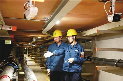 青岛供电公司工作人员对220千伏延吉路电缆隧道进行测温巡视,保障青岛电网安全稳定运行。