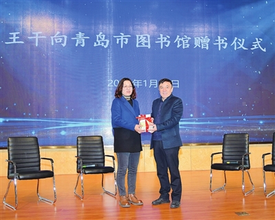 市图书馆馆长徐月霞接收王干(右)赠书。