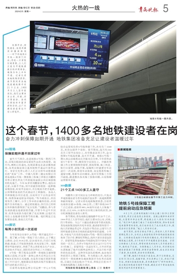 目前青岛地铁运营公司运营一中心6号线综合运管部负责6号线参建工作,共有员工1168名,来自全国多个省份。春节期间,每天约160名员工坚守在岗位上,有序推进各项工作,全力保障6号线高质量、高水平开通。地铁6号线一期九顶山站值班站长许敏来自吉林,今年将和此前5个春节一样,继续坚守在岗位上。许敏的参建工作主要围绕物资接管、班组管理、施工核查、轨行区接管、演练开展,每隔两小时就要对车站进行一次巡视,排查车站装修、安全隐患和施工遗留问题,更新车站问题库,及时反馈施工方项目缺陷,跟进整改各类施工装修问题,从而保障运营服务质量。