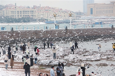 栈桥上成群的海鸥一边嬉戏一边觅食,呈现出一幅秀美的冬日画卷。 观海新闻/青报全媒体 记者 梁超