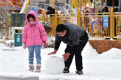 爸爸带着女儿在滚雪球。 观海新闻/青报全媒体 记者 于滈
