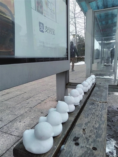 汇泉广场公交车站长凳上,有人放了一排可爱的小雪鸭。王法军 摄