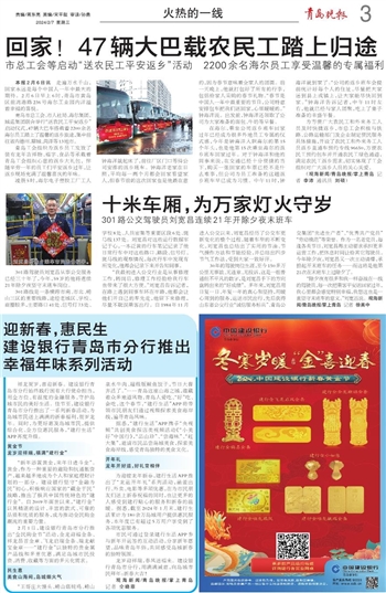 青岛工会组织为返乡员工发放了装有龙年吉祥物、福字、食品等承载着青岛工会组织心意的返乡大礼包, 伴随辛劳一年的员工们平安返乡过年,让返乡现场充满了温馨喜庆的年味。