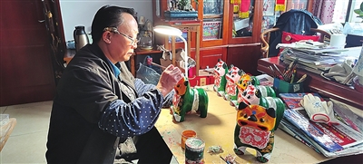 山东省非遗传承人聂臣希在绘制创意泥老虎。