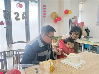 在项目部餐厅里,伴着欢快的生日歌,生日蜡烛的火苗映照着一家三口的幸福笑脸,谷子琪为女儿补办了一周岁生日宴,弥补了一个多月前无法回家陪女儿过生日的遗憾。
