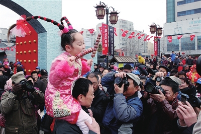 到2015年,9岁的刘依芃再次坐上姥爷的肩头,明显长高的“萝卜妹”依旧成为众人追捧的焦点。也是在这一时期,有多个经过精心打扮的青岛娃娃坐在家长的肩头赶节会,成为一批新晋的“萝卜妹”。