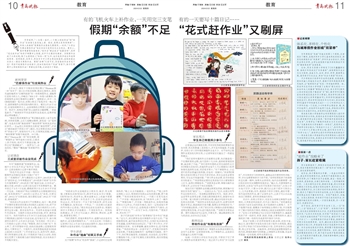 家长们对于假期作业的建议则更加具体,特别集中在家长任务的“减负”上。一名家长认为,“艺术、垃圾分类等作业比较形式化,一些表格还需要家长代写。阅读、研学、运动等作业很有必要,但建议取消填表形式,鼓励学生自主开展。复习和预习学科很有必要,建议学校给学生找一些相关的资源。”“阅读作业有些是读过的书,还要写很多篇读书笔记,耽误阅读其他书籍,假期应该多阅读好书。”“手抄报建议取消,占用了家长时间。《寒假生活指导》建议老师定期发答案,学生进行批改纠错。”“语数英非常有必要。课外实践活动可以适当,不要太多。建议取消家长参与的活动,由学生自己完成。”