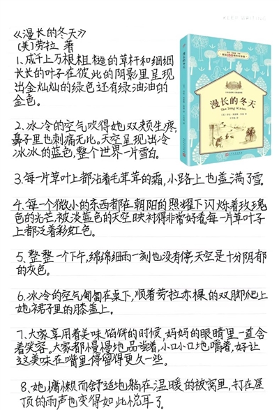 “我的语文作业是预习下学期课文,每日一课;背诵下学期所有要求背的课文和《阅读之旅》的古诗;将下学期所有生字练硬笔书法;作文4篇;每日阅读约1小时;读书记录4篇。数学没有作业。英语作业是每日读课外英语绘本。实践作业是社会劳动实践、研学、体育每日打卡。我的书面作业2月18日已全部完成;背诵作业只剩《阅读之旅》的古诗没完成,还有每日打卡、每日阅读仍在进行中,2月25日会完成。”在市南区一所小学上三年级的小记者小牟说,“寒假里,我们五行缺‘玩’!我太难了,背书背得好辛苦,妈妈在旅游路上还督促我背课文,可算背完了。可是昨天,我突然想起来还有《阅读之旅》的古诗没背。”小牟的家长认为,虽然写作、阅读、预习和背诵有必要,但三年级的孩子缺乏主动性,导致家长花费了大量的精力进行督促和检查,而且有些孩子不易配合家长。
