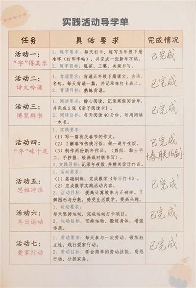 比如,青岛文登路小学制定了《龙行龘龘新征程 海纳少年悦成长》“任务清单”,该校寒假作业分为五大板块,涵盖文化、运动、劳动、研学、健康等主题,倡导孩子们走出去,参加“社会大课堂”的活动。