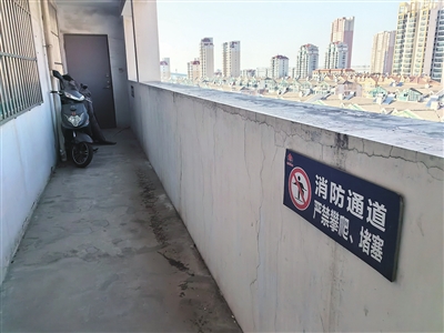 消防安全连廊是很多高层住宅的必备设施,一旦失火,高层住宅居民可通过连廊迅速转移到隔壁单元。但记者在5号楼内探访时却发现,11层的消防安全连廊内停着一辆电动自行车——一旁还贴着提示牌:消防通道严禁攀爬、堵塞。