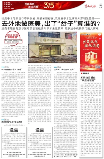 近日,市民林女士(化名)拨打本报热线电话82860085,讲述了一段令人无奈的医美经历。三年前,她经青岛双华医疗美容介绍,双方共同前往青州双华医疗美容,接受了双眼皮、3D无痕拉皮、去眼袋三项医美手术,花费共计4.2万元。然而,术后效果并没达到预期,不仅左右眼的外形差异大,因手术导致的头皮“斑秃”也迟迟没有恢复,给林女士的工作和生活造成了不小的压力和影响,一波三折的维权经历更让她心力交瘁……
