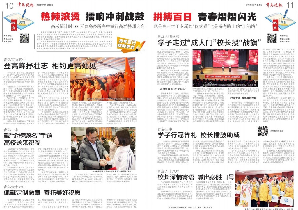 高考百日誓师,是高三学子专属的“仪式感”,也是备考路上的“加油站”。距离2024年高考还有100天,连日来,青岛多所高中学校举行形式多样、振奋人心的高考百日誓师活动,在老师和家长的温情勉励下、学弟学妹的真挚祝福中,高三学子们热血澎湃、整装待发。冲刺的战鼓已经擂响,青春在拼搏中熠熠闪光。
