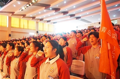 青岛六十八中百日誓师大会上学生喊出铮铮誓言。 徐歌 摄