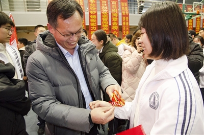 一中校长严贤付为高三学生戴上“金榜题名”手链。