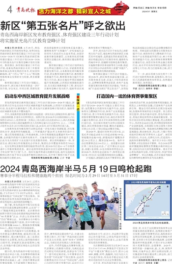 计划提出,鼓励新区高水平赛事举办、群众体育活动开展、社会投资体育场馆建设、省级及以上体育园区创建,打造体育产业发展新引擎。健全信用约束和失信联合惩戒机制,加强体育领域市场主体监管。助力青岛国信篮球、青岛西海岸足球、青岛西海岸女足、青岛红狮足球等俱乐部高质量发展。加快中国羽协青岛训练比赛基地、灵山湾奥体中心、风河生态运动公园、淮河路国家级体育产业创新基地、永保国际文体公园等大型体育场馆建设启用。推进唐岛湾赛艇训练比赛基地建设,推动唐岛湾、灵山湾、古镇口等优质海岸区域实现“四季有水上运动”。新区坚持国际化、专业化、品牌化方向,打造国内一流的体育赛事集聚区。每年至少举办1项国际赛事、5项全国高水平赛事。申办2026世界海岸赛艇锦标赛暨世界赛艇沙滩冲刺总决赛、国际国内羽毛球等高端赛事。高水平举办青岛西海岸全程、半程马拉松,争创“国家金牌赛事”。举办沙滩跑、沿齐长城系列城市定向赛等特色赛事和系列冠名赛事。