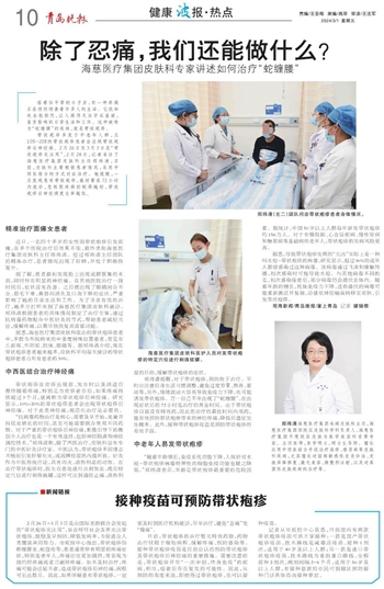 郑玮清提醒,对于带状疱疹,预防胜于治疗。平时应注意自身生活习惯调整,避免过度劳累、熬夜、着凉等,另外,情绪波动大容易导致免疫力下降,也可能诱发带状疱疹。万一自己不幸出现了“蛇缠腰”,在出现症状后的72小时是治疗的黄金时间。由于带状疱疹目前没有特效药,因此在治疗的最佳时问内用药,能有效预防带状疱瘆带来的神经疼痛,降低后遗症发生概率。此外,接种带状疱疹疫苗是预防带状疱疹的有效手段。