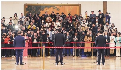 3月4日,全国政协十四届二次会议首场“委员通道”集体采访活动在北京人民大会堂举行。新华社发