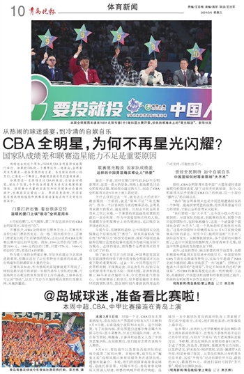 本报3月5日讯 时隔一个月,CBA将在本周重燃战火,青岛国信水产男篮将分别在3月7日晚和3月9日晚,主场迎战宁波队和北京队。这个间歇期,为了补强内线,青岛男篮引进塞尔维亚籍大外援马尔科·查卡莱维奇,并且已经随队训练。此外,在春节期间,杨瀚森、王睿泽和赵嘉义入选了中国男篮集训队,在间歇期后,他们能有怎样的表现令人期待。