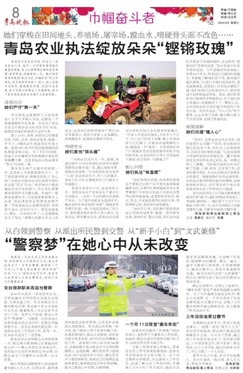 农业执法岗位上从不缺乏散发着美丽光芒的“她”们,她们穿梭在田间地头、养殖场、屠宰场……她们是千千万万个巾帼奋斗者中的一员,在平凡的岗位上贡献智慧和力量,不断书写新的巾帼华章。 观海新闻/青岛晚报/掌上青岛 记者 高静文 通讯员 刘倩