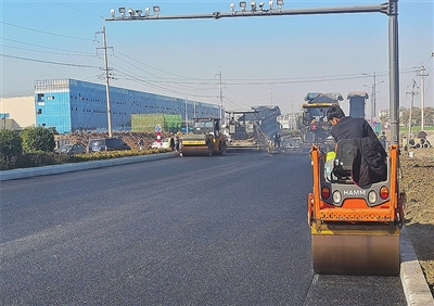 上合卡奥斯新城—九城路沥青路面铺设施工。