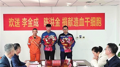 本报3月12日讯 近日,两位热血青年李金成和陈洪金即将在青岛市中心医院捐献造血干细胞,为两位素不相识的病患点燃新生的火种。3月12日,西海岸新区红十字会为两名造血干细胞捐献者举行了欢送仪式。