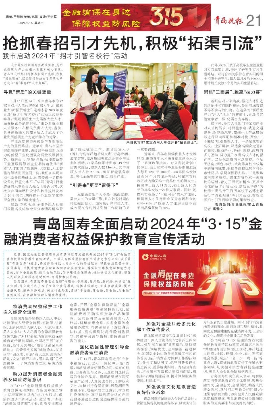 青岛国寿全面启动2024年“3·15”金融消费者权益保护教育宣传活动