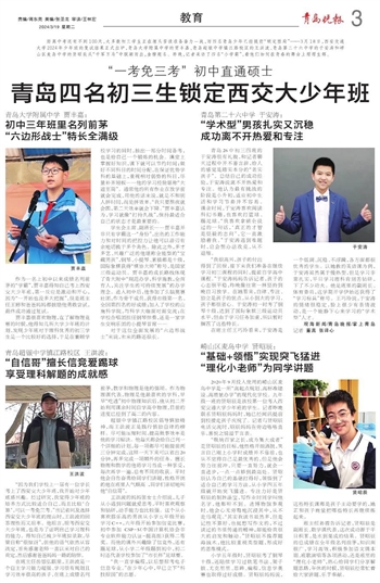 距离中考还有不到100天,大多数初三学生正在埋头苦读准备奋力一战,而四名青岛少年已经提前“锁定胜局”——3月18日,西安交通大学2024年少年班的复试结果正式出炉,青岛大学附属中学的贾丰嘉、青岛超银中学镇江路校区的王洪波、青岛第二十六中学的于安涛和崂山区麦岛中学的贤昭辰从“千军万马”中脱颖而出,金榜题名。昨晚,记者采访了四名“小学霸”,看他们如何在青春的舞台上熠熠生辉。