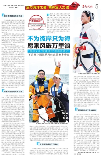 经过多年努力,宋坤考取了英国皇家游艇协会的离岸船长资格,成为了美国帆船协会的教官,这些技术和能力上的进步,激励着她做更多的航行。“‘山月知我心底事,一岁一礼望顺遂’。3月底开始,又要外出航海了,今年我会先参加一个中国海的长航职业比赛,从中国香港的维多利亚港开船到菲律宾的苏碧湾。”宋坤向记者讲述了近期计划,“4月,我会用20多天的时间环中国海航行,从海南三亚途经深圳、厦门、宁波、上海,最终抵达家乡青岛。除了职业船员外,也会带想体验长航的船员一起,大约三四天一段,让更多人有机会跟我一起航行。我会把这些故事记录下来,通过‘宋坤爱航海’多个社交平台分享给更多人,让航海的故事更丰富。”