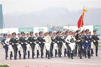3月23日,中国人民解放军仪仗司礼大队方队在巴基斯坦首都伊斯兰堡参加阅兵式。新华社发