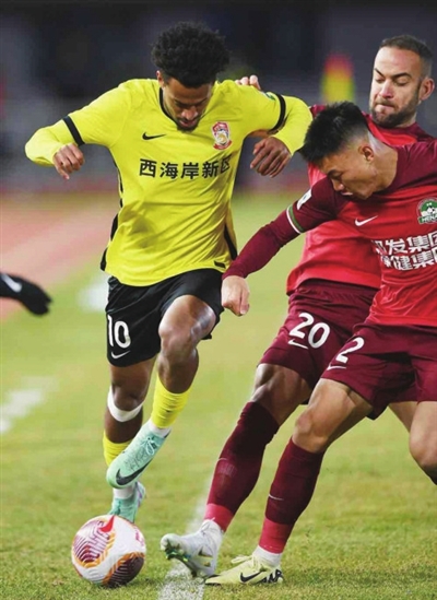 青岛西海岸队球员内尔松卢斯(左一)在比赛中带球突破。新华社发