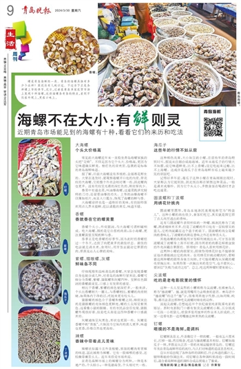 螺是青岛海鲜的一类。青岛的海螺具体有多少个品种?真还没有人统计过。不过当下正是各种螺上市的季节,近日,记者在青岛多家农贸市场上发现十种海螺,这些海螺各有各的特点,差别不仅在外观上,更在口味上。