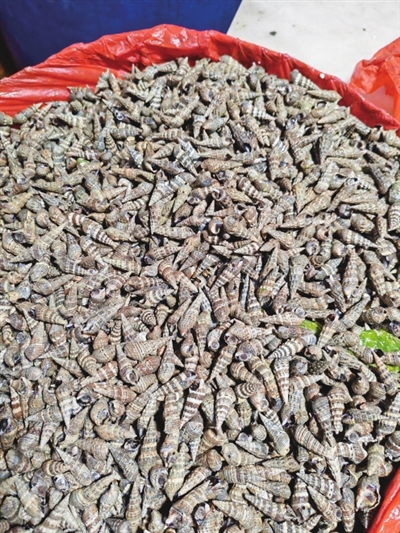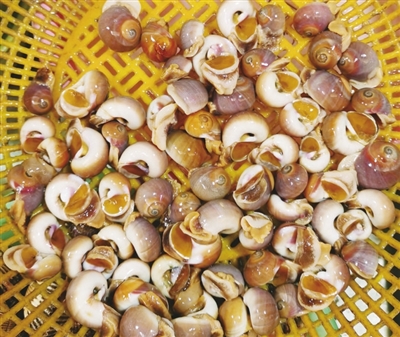 圆波螺呈圆形,青岛本地渔民直观地称它为“转盘儿”。这种小螺的肉也很少,食客们吃它,其实就是图它那丁点儿肉里透出的香味。