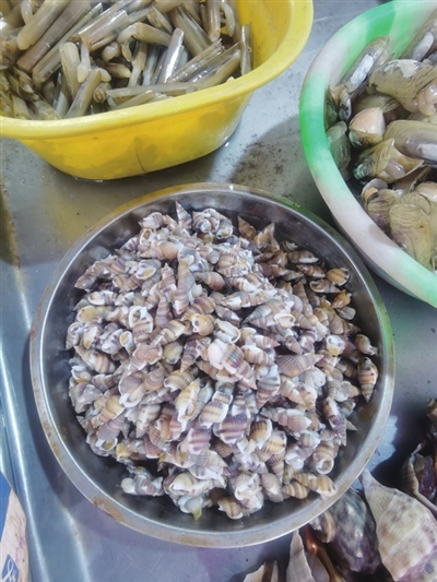 在青岛海鲜市场上的辣螺分为两种,一种是本地产的,个头较小;一种是渤海货,个头相对大一些。
