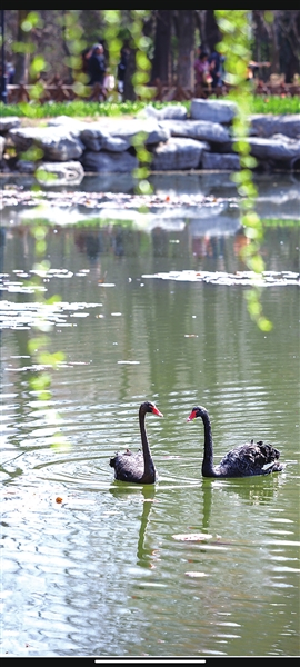 黑天鹅在湖中嬉戏。 苗淼 摄