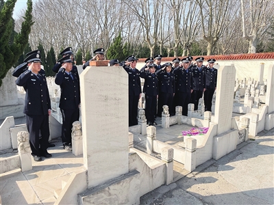 当天,胶州市公安局组织40多名民警、辅警到胶州市烈士陵园祭扫。在烈士纪念碑前,全体民辅警整齐列队,脱帽肃立,向革命先辈鞠躬默哀。在胶州烈士纪念馆,他们面向党旗、举起右手,重温入党誓词。
