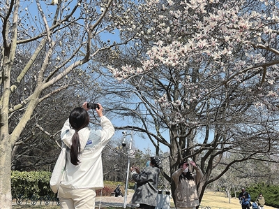中山公园里的玉兰吸引游人拍摄。 张琰 摄