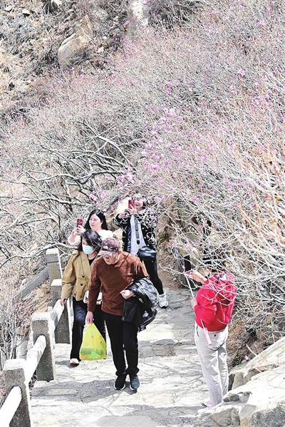 在青岛西海岸新区,春天寄来了多封“邀请函”,其中一定有一封是大珠山寄来的。每年的最美四月天,去大珠山踏春游园赏漫山遍野的杜鹃花,是许多市民游客打开春天的私藏方式。记者在登山途中看到,山间溪水潺潺,抬头便能望见山腰处绽放的杜鹃花,杜鹃花谷繁花盛开,花瓣层层叠叠,花瓣边缘微微卷曲,花蕊精致如珍珠,点缀在花瓣之间,增添了几分灵动与生机。据工作人员介绍,由于春日暖阳来得有些迟,低温天气推迟了杜鹃花的绽放时间,但也促成了盛花期与清明节小长假的相遇,假期是赏花的最佳时期,诚邀市民游客前来赏花、游玩。