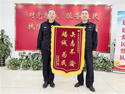 吴先生将锦旗送到派出所致谢。