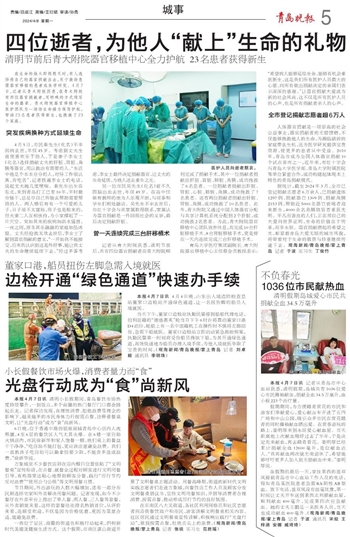 在生命的烛火即将熄灭时,有人选择将自己的器官捐献出去,用于救助急需器官移植的患者或医学研究。4月7日,记者从青大附院获悉,在青大附院有四位器官捐献者,用特殊的方式续写生命的篇章。青大附院器官移植中心医护团队为一场场生命接力保驾护航,帮助23名患者获得新生,也挽救了23个家庭。