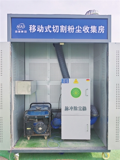外面配收集袋、内壁有消音面板、顶部还有抽风机……在崂山区科苑经七路项目施工现场,这样一个外表看上去不显眼的小房子,却有满满的高科技。日前记者从崂山区城管局主办的崂山区市政公用工程扬尘防治创新措施观摩会现场获悉,由青岛海德工程集团股份有限公司项目团队研制的移动式切割粉尘收集房给出了扬尘治理的“青岛样板”,已申报国家实用新型专利。
