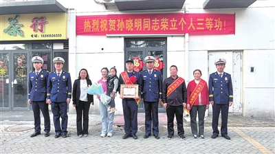 当天上午9时30分许,青岛市消防救援支队政治部主任刘玉振、青岛开发区消防救援大队教导员魏恒德、大队长侯峰走进小区,将鲜花和奖状送到了消防员孙晓明手中,随后为孙晓明的父母、妻子戴上了表彰绶带——孙晓明因为表现优秀,荣立个人三等功。为了鼓励孙晓明发挥先锋模范作用,在岗位上再立新功,支队和大队专门在他居住的小区举行了“喜报送到家”仪式。