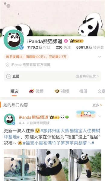 如今在互联网时代,追熊猫的粉丝们以更多的方式宠爱大熊猫。就在4月3日,旅韩大熊猫“福宝”从韩国归国,众多粉丝追看直播。而央视网打造的“iPanda熊猫频道”的微博粉丝已经超过 1756万,每条视频平均浏览量达100 万+。还有关于熊猫的短视频、慢直播也广受欢迎。在粉圈运作规范的影响下,追熊猫这件事也变得越来越“专业”。