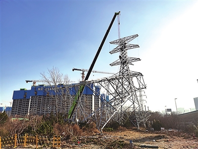记者了解到,2023年,合肥路220千伏高压线下地启动建设,新建单舱电力管廊约3千米、双舱电力管廊约2千米,于当年10月22日顺利送电,实现了输电线路下地入廊。但原有的高压输电线路和41基高压铁塔仍影响城市形象,同时制约着张村河两岸及生态公园等重点项目的推进实施。