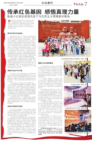 “站在这里,我们仿佛穿越了时光,亲身感受城市老区因地制宜科学规划、旧貌换新颜的发展成就。我们眼前的这个地方,正是马克思主义在中国传播的重要见证地。凝视着墙上马克思的照片,我感觉他的眼神里流露出对真理的不懈追求和对人民的关怀,一股强大的力量直击心灵。在展厅里还观看了纪录片,那些历史的画面让我们仿佛置身于那个时代,感受到了马克思主义的伟大。”青岛五十三中小学部的杨子航一路参观,一路聆听,内心被深深地触动着,“我们要珍惜今天来之不易的幸福生活,传承红色基因,不负时代,勤奋学习,长大后接续建设伟大的祖国。”