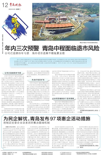 近日,青岛中程发布《关于公司股票可能被实施退市风险警示的第三次风险提示公告》,该公告称,青岛中资中程集团股份有限公司(以下简称“公司”)预计2023年度期末净资产为负值,公司在披露2023年年度报告后,股票可能被深圳证券交易所实施退市风险警示。这已经是青岛中程年内第三次发布退市风险警示。今年1月30日、3月15日,青岛中程也曾发布有可能实施退市的风险警示。
