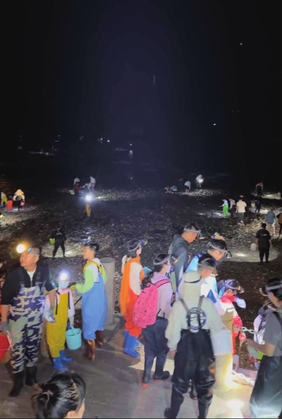 在真真等资深赶海人的耐心指导下,许多赶海“小白”在寻找八爪鱼的过程中找到了乐趣。新手们快速入门,小心翼翼踩在泥地上,对着一众洞口,眯起一只眼睛细心观察。确认目标后,手起铲落,沙砾里依稀露出黑褐色身影,出手“掏”宝的技巧不断成熟。不多时,男女老少脱下水裤,喘着粗气将各类“珍宝”提上岸来,彼此指点着如何实现“爆桶”。除了常见的解惑答疑,赶海人还收到了许多来自内陆游客的感谢。