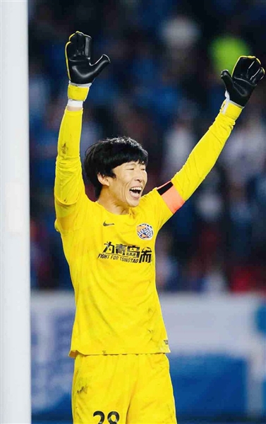 青岛海牛队守门员牟鹏飞在比赛中指挥队友。 新华社发